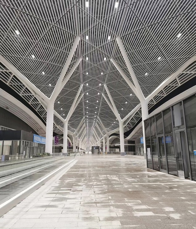 幕墻類型:屋面玻璃采光頂+鋁板幕墻、鋁合金吊頂格柵幕墻、蜂窩鋁板幕墻、框架式明框幕墻等